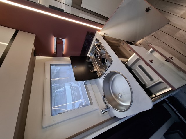 • Cucina lineare a 2 fuochi e lavello circolare in acciaio inox
