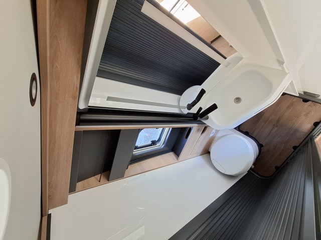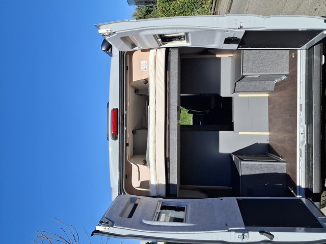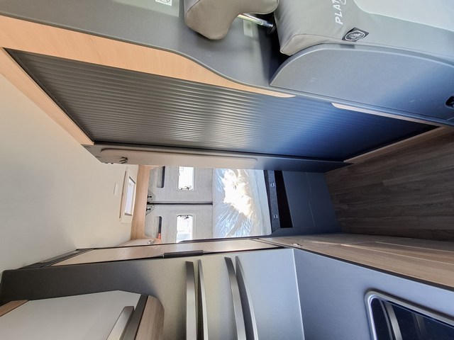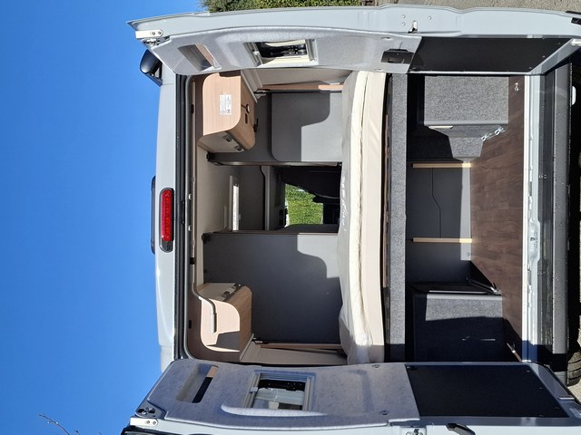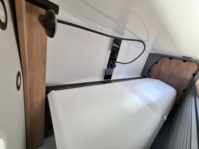 Letti matrimoniali trasversali nella zona posteriore con reti a doghe su tutta la larghezza