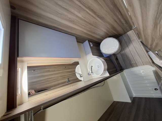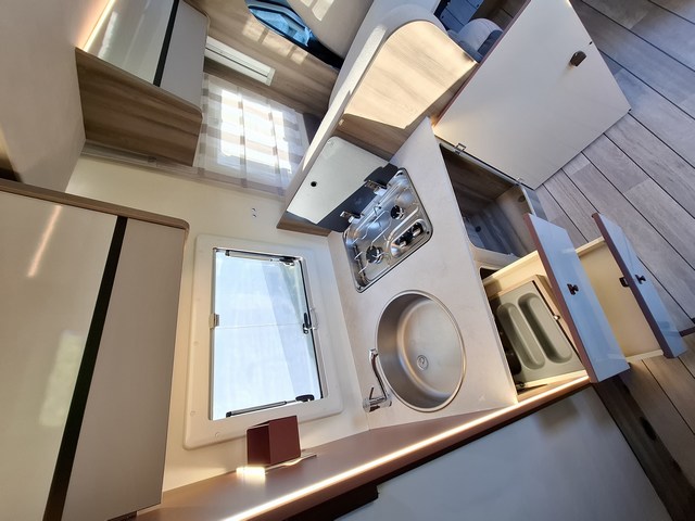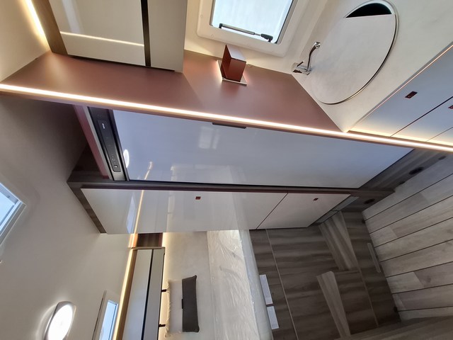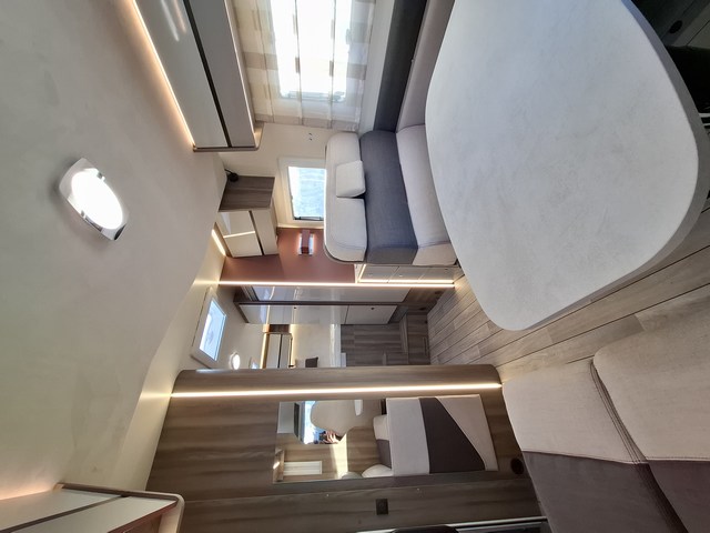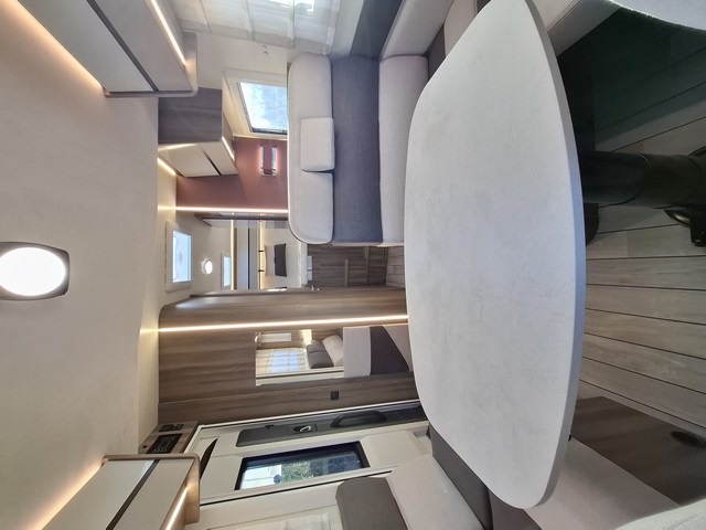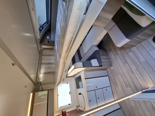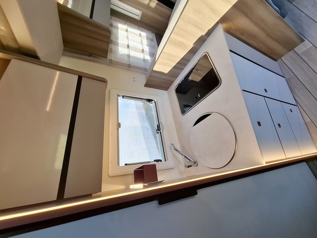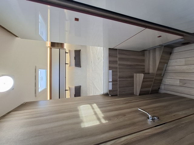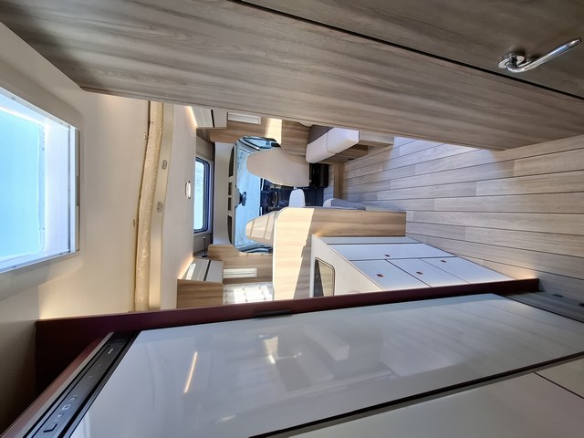 Pareti EXPS: Massima impermeabilità e isolamento acustico dell'abitacolo. Pareti interne e pavimento in materiale plastico impermeabile • Spessore pavimento: 54 mm • Spessore soffitto e pareti: 30 mm • Tetto esterno in fibra di vetro • Pareti interne/esterne in fibra di vetro • Piastrello inferiore del telaio rivestito in fibra di vetro